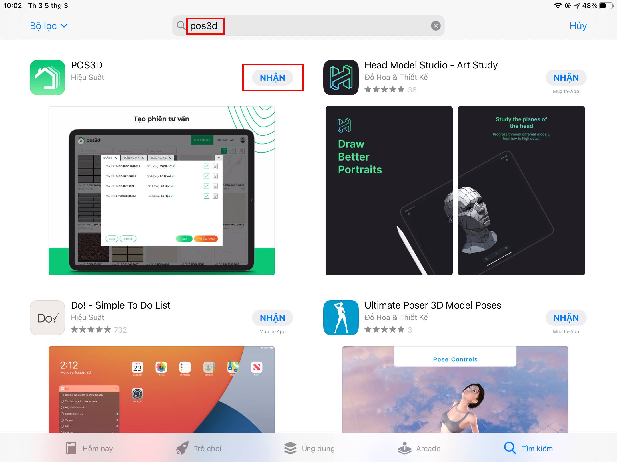 2. **Tìm ứng dụng:** Sử dụng thanh tìm kiếm ở phía trên để nhập tên "POS3D".